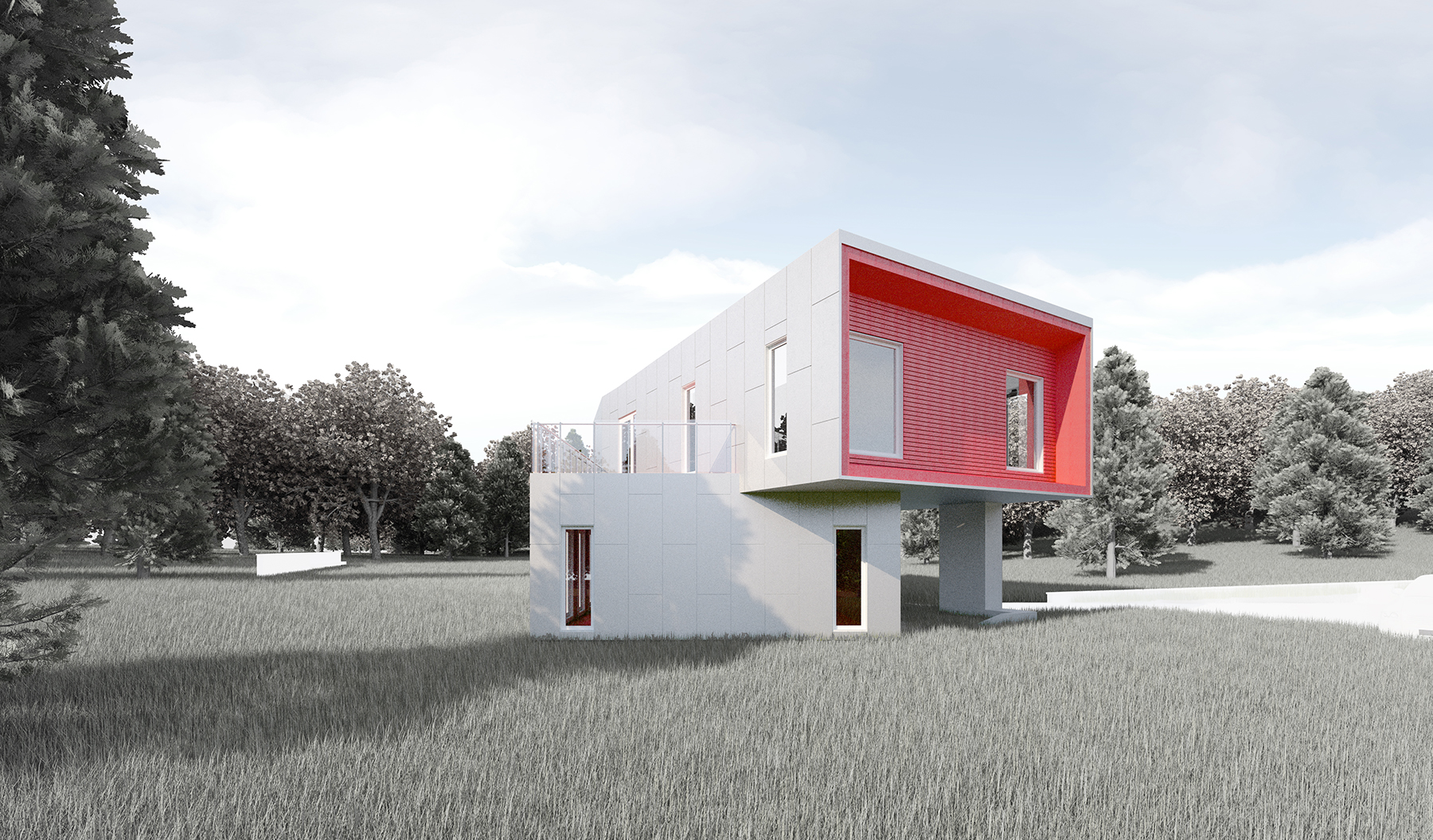 The house also challenges the idea of a siteless prototype, which is typically designed for a flat terrain. In this case, the house uses half levels, giving it the possibility of being constructed on a sloped site. Alternately, it can be grounded on a flat site with the kitchen sunken a half level into the earth and opening onto a private court for reading, al fresco dining, or entertaining.